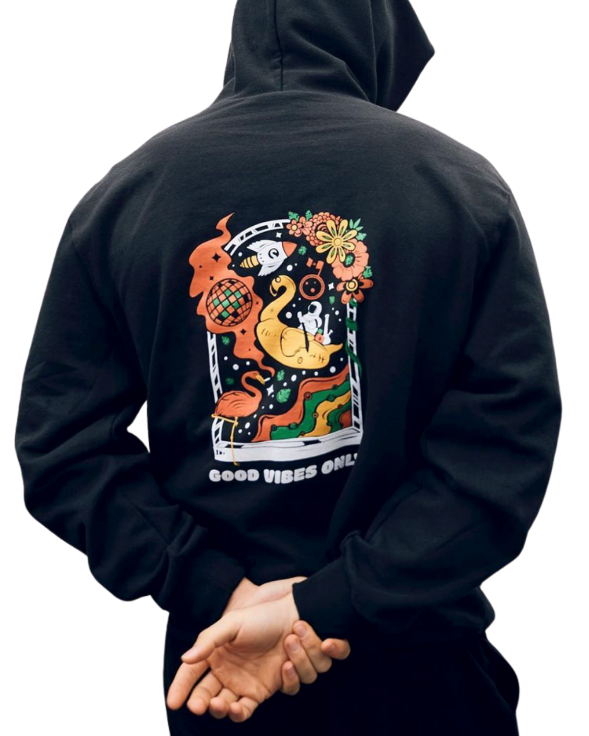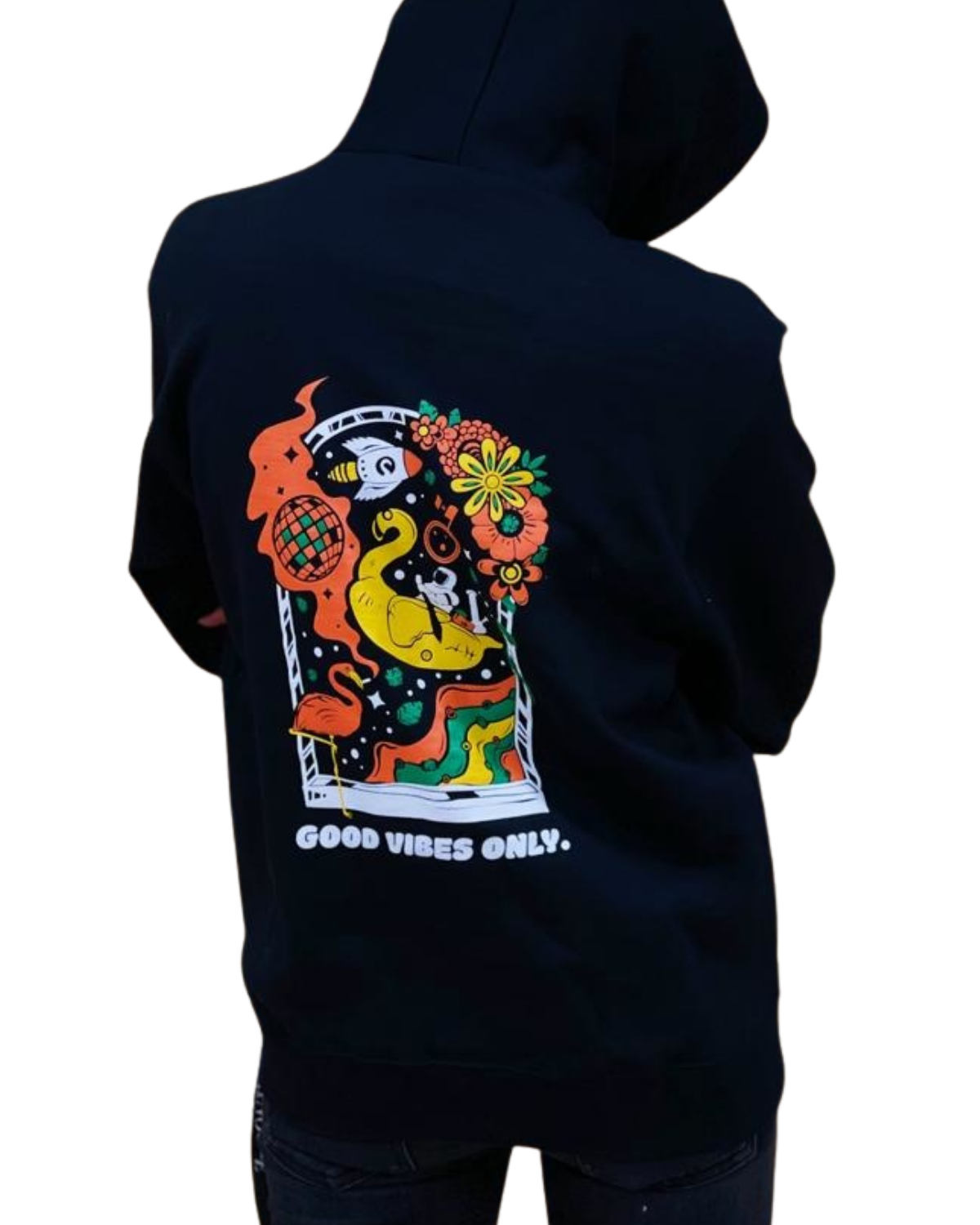 This hoodie's design was inspired by 420 culture and good vibes only! It has unique trippy Flamingo graphics on the back and "Good Vibes Only" sign on the front. We love streetwear, and creating this design was our way to pay homage to this growing style!