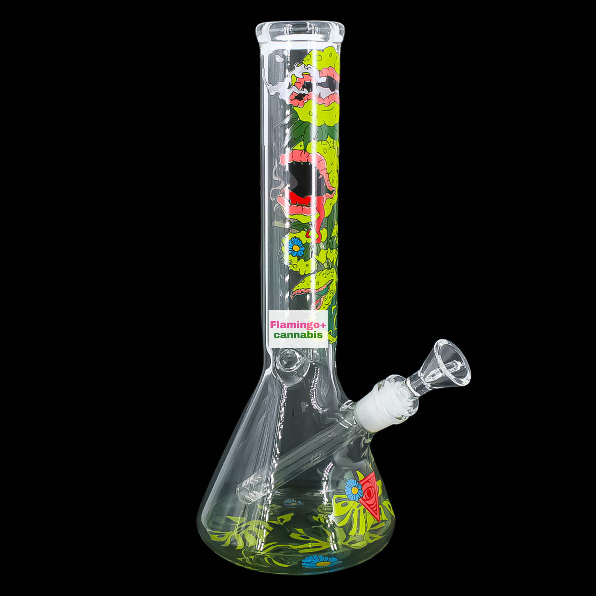 The Red Eye Glass 12” Feed Me Venus Fly Traps Beaker Bong is a plant with bite—and it’s hungry for monster rips. Decked out with carnivorous flower decals, this piece is as eye-catching as it is functional, making it the perfect blend of novelty and performance.