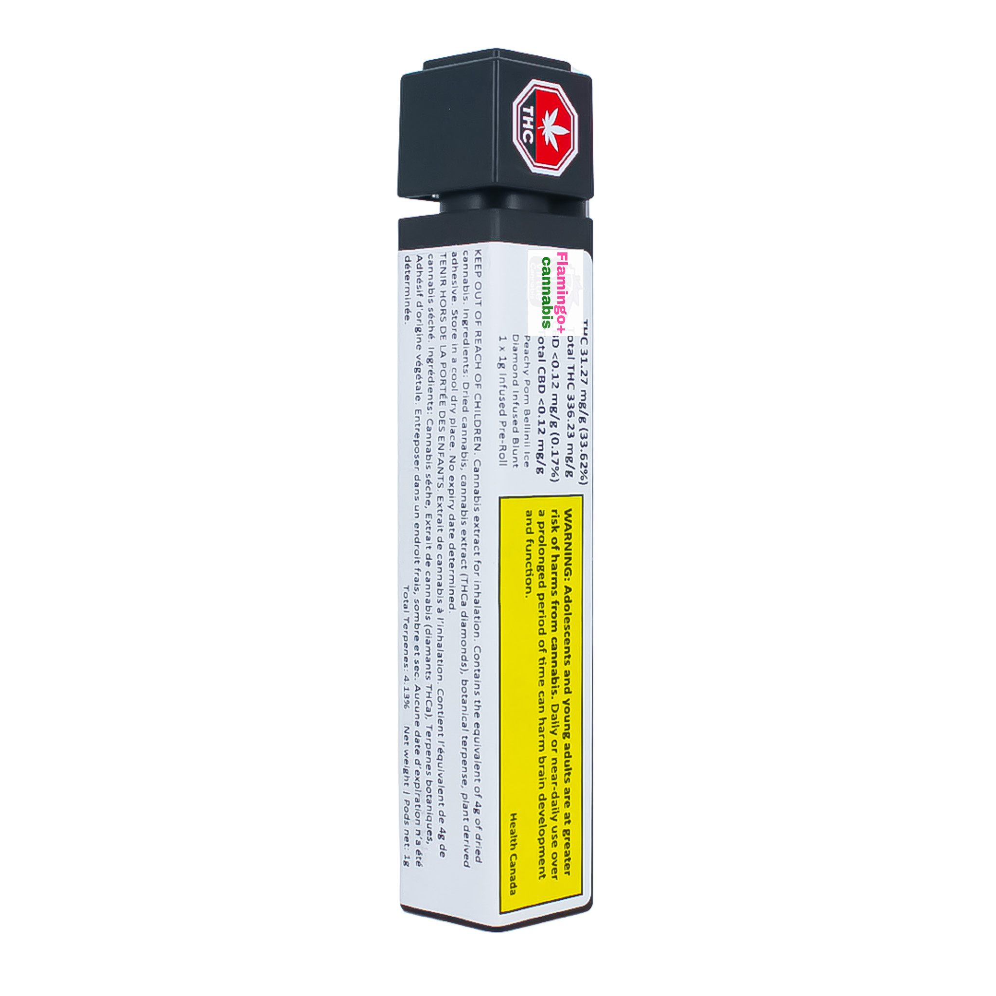 Rolled in a signature botanical wrap, each Peachy Pom Bellini blunt is loaded with select hybrid cannabis flower, rich in myrcene and caryophyllene, then taken up a notch with infused diamonds, dusted in golden kief, and finished with a custom terpene curation for maximum flavour. Smooth, bold, and beautifully balanced, this 1x1g infused blunt is perfect for cannabis connoisseurs looking for an elevated sesh.